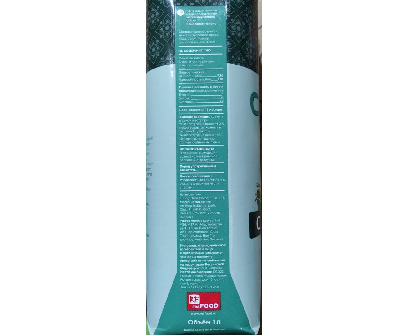 Состав: переработанная мякоть кокосового ореха, вода, стабилизатор: гуаровая камедь, ксантановая камедь.