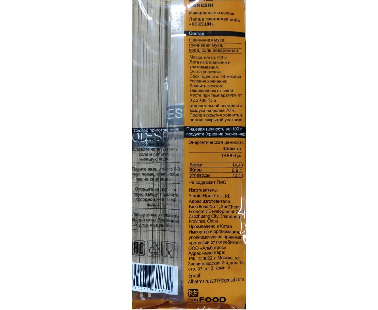 Лапша гречневая соба, продается в ПЭ пакетах весом 0,3 кг. Количество штук в коробке 40 шт. Состав: Пшеничная мука, гречневая мука, вода, соль. Срок годности: 24 месяца Условия хранения: Хранить в сухом, прохладном месте. После вскрытия хранить в плотно закрытой упаковке. Эн. ценность: