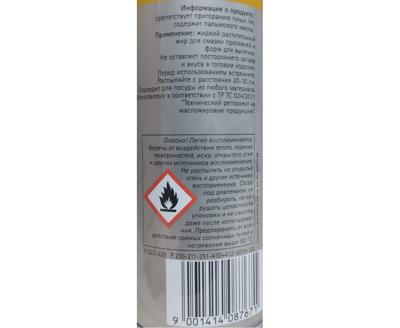 Состав: растительное масло (рапсовое), эмульгатор (лецитин), упаковочный газ (пропан, бутан, изобутан).