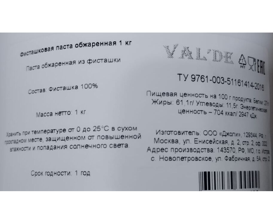 Паста Фисташковая из жаренного ореха VAL'DE 1кг*6 Россия