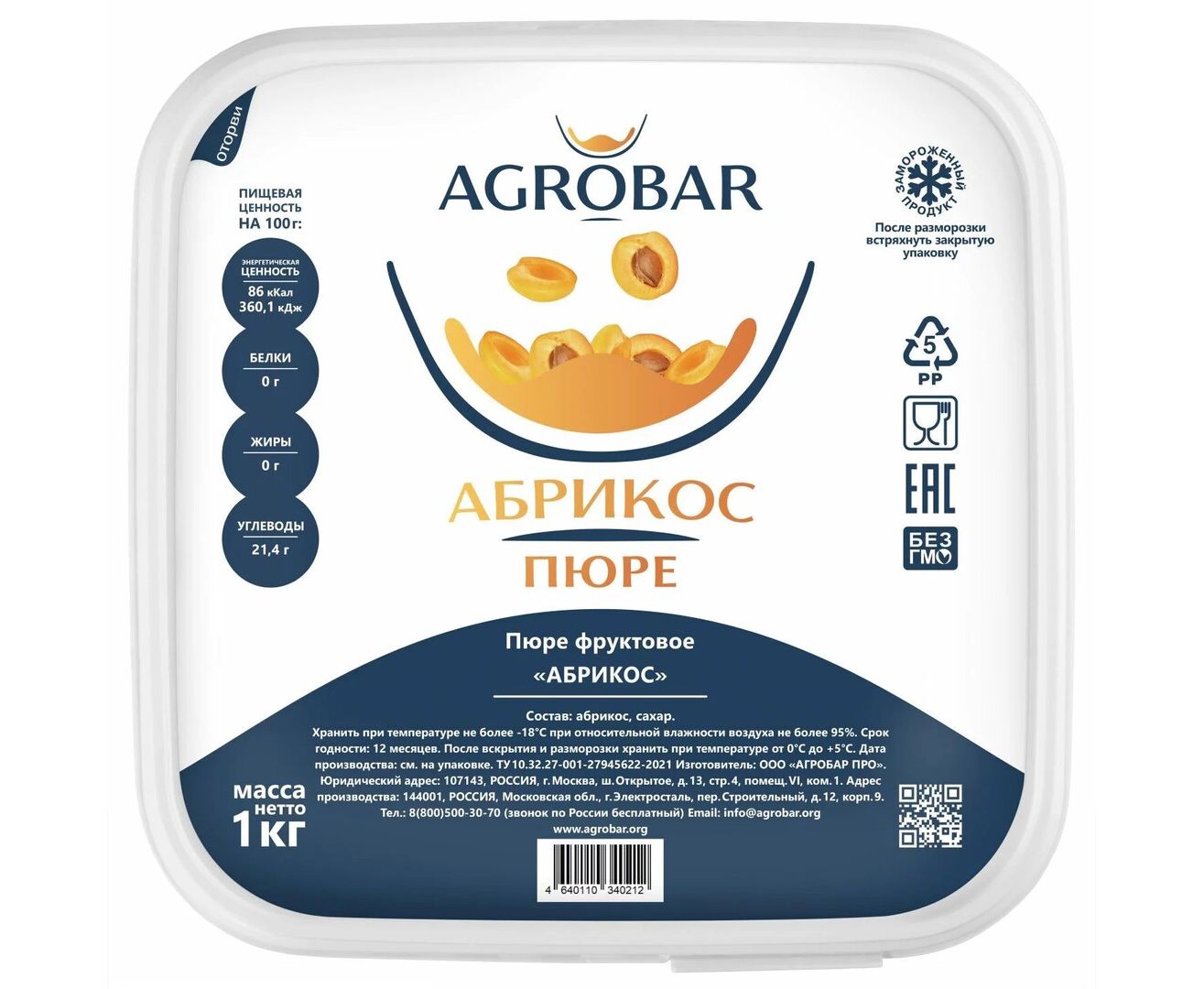 Описание товара "Пюре абрикоса 1кг*6, AGROBAR, Россия"