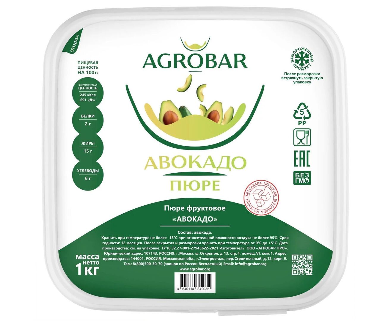 Описание товара "Пюре авокадо без сахара 1кг*6, AGROBAR, Россия"