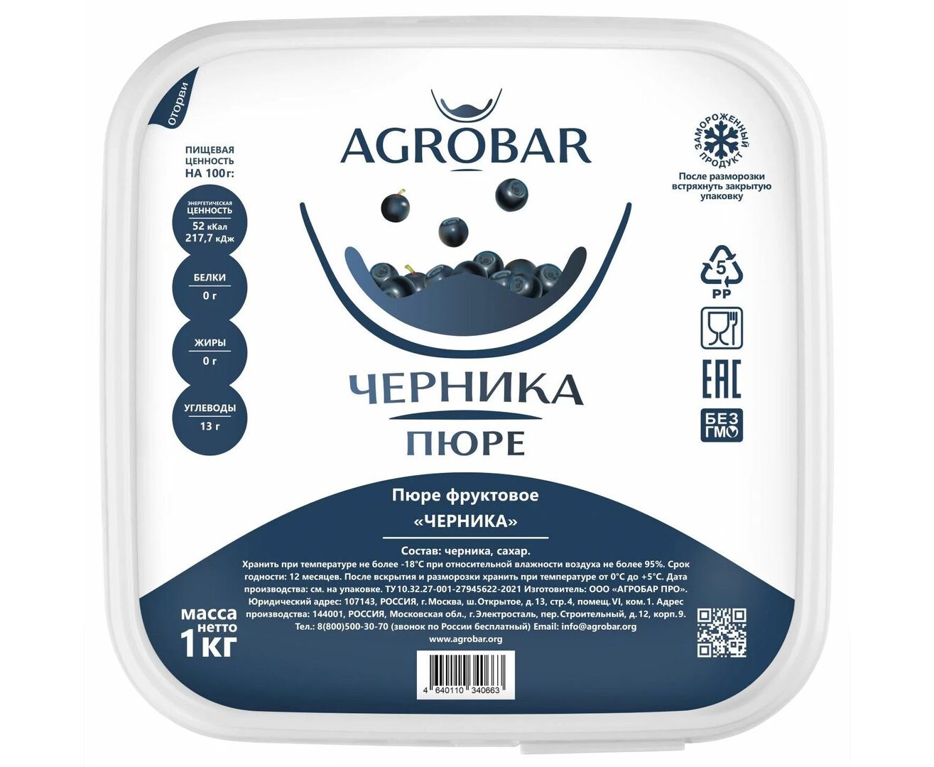Описание товара "Пюре черника 1кг*6, AGROBAR, Россия"