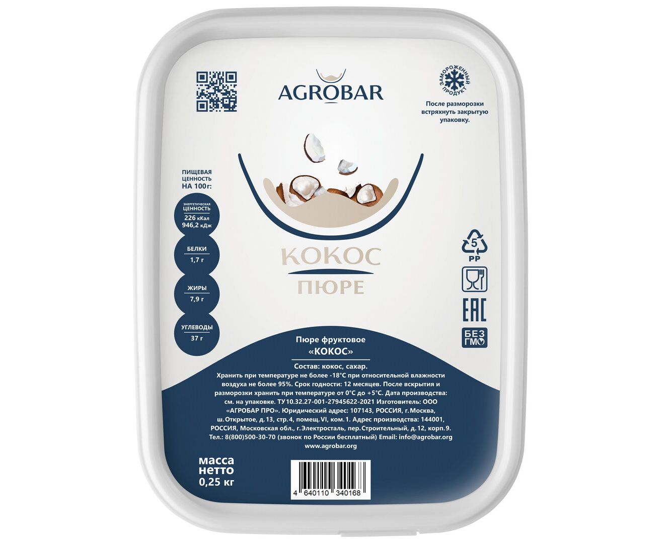 Пюре кокос 250г*12, AGROBAR, Россия