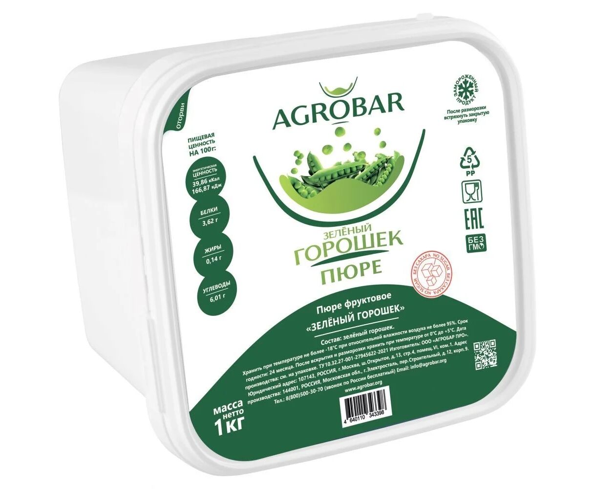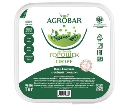 Пюре зеленый горошек без сахара 1кг*6, AGROBAR, Россия