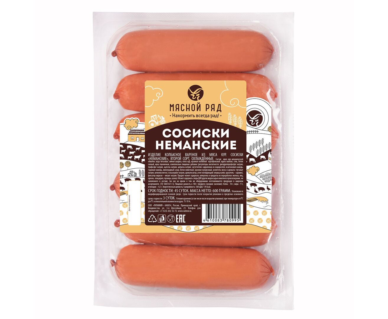 Описание товара "Сосиски Неманские ст.вес 600г 1шт"