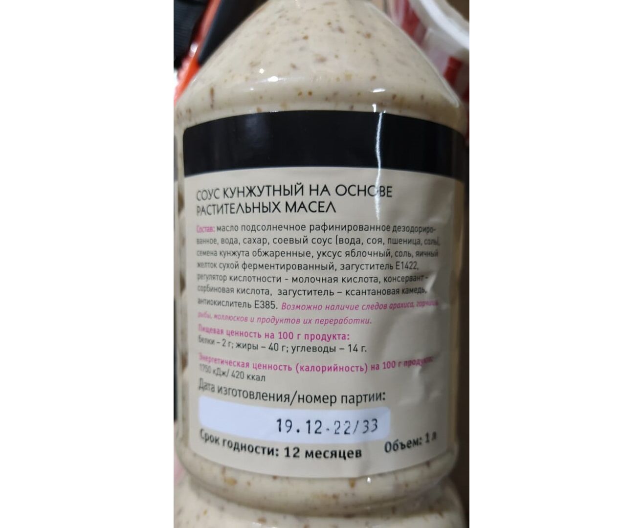 Семена кунжута богаты кальцием, фосфором и магнием. В составе соуса входят: кунжутное семя, уксус, соевый соус, соль, сахар, яичный сухой желток, растительное масло. 100% натуральный продукт.