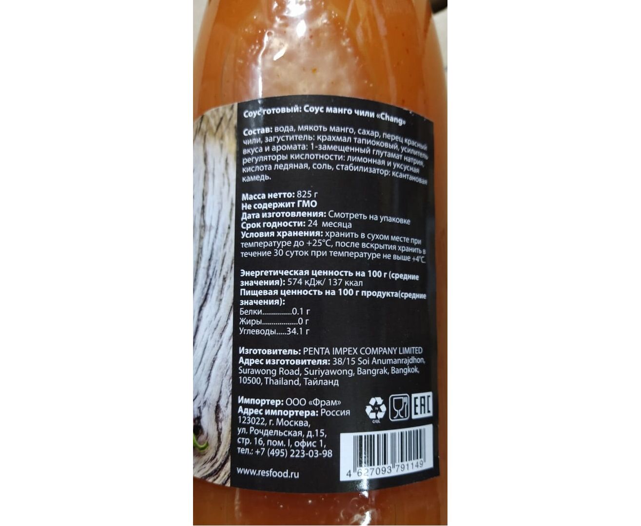 Состав: вода, сахар, мякоть манго, перец красный чили, загуститель: крахмал тапиоковый, соль, усилитель вкуса и аромата: глутамат натрия, регулятор кислотности: уксусная кислота, стабилизатор: ксантановая камедь, антиоксидант: метабисульфит натрия.