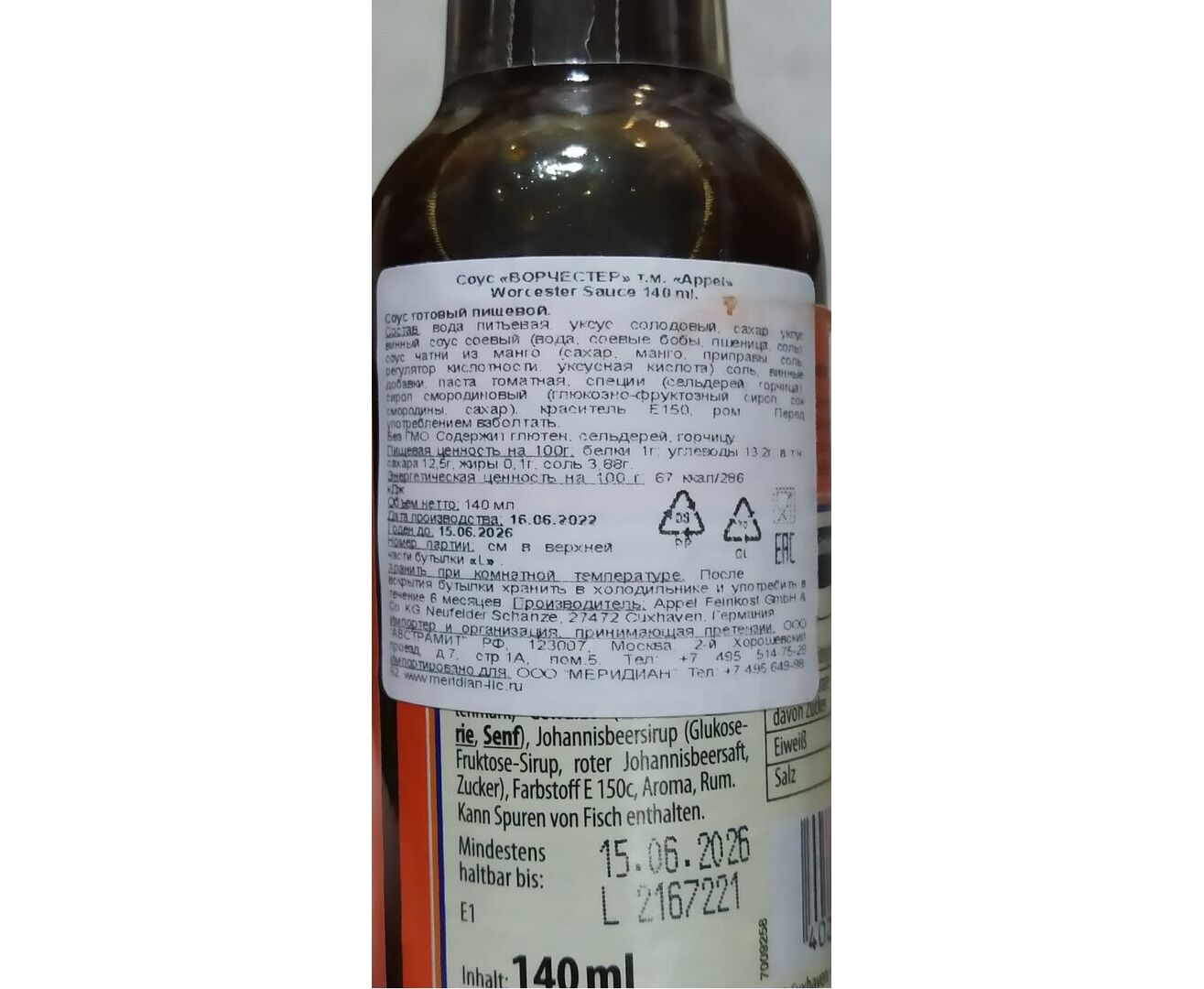 Соус Appel "Ворчестер" - отличная добавка для блюд из рыбы, морепродуктов. Может использоваться как маринад для мяса, шашлыка, крылышек, салата Цезарь. Прекрасный ингредиент для коктейлей. Представляет собой пряную, сильно концентрированную приправу, напоминающую густую жидкость.