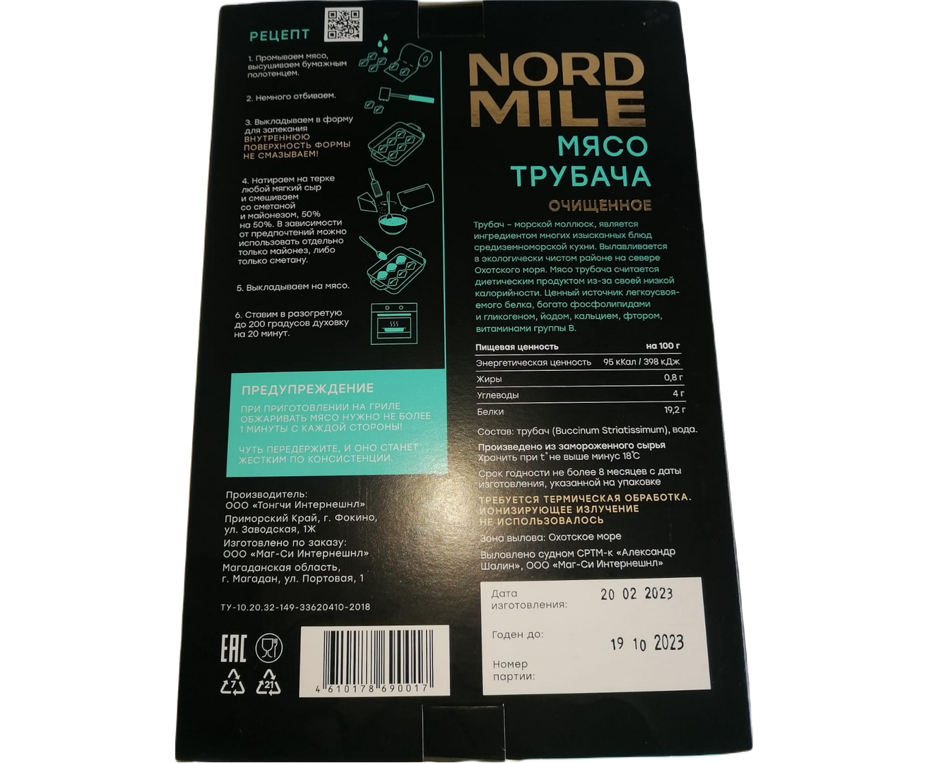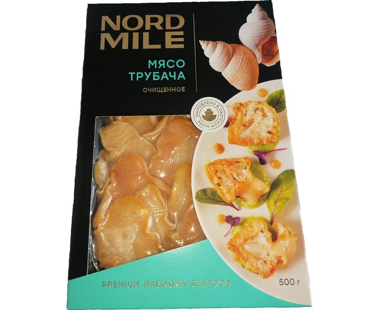 Трубач - морской моллюск, является ингредиентом многих изысканных блюд средиземноморской кухни. Вылавливается в экологически чистом районе на севере Охотского моря. Мясо трубача считается диетическим продуктом из-за своей низкой калорийности. Ценный источник легкоусвояемого белка, богато фосфолипидами и гликогеном, йодом, кальцием, фтором, витаминами группы В.